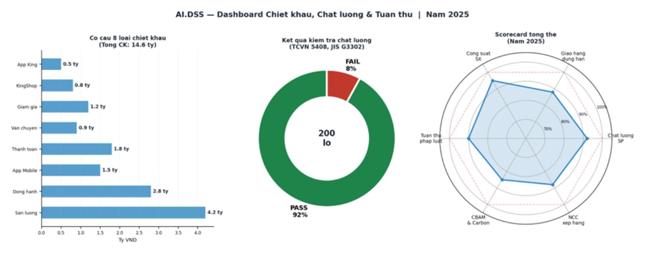 Chiết khấu được bóc tách chi tiết theo từng loại và tỷ trọng trên doanh thu, từ đó kiểm soát chính xác margin thực. Dữ liệu chất lượng (tensile, coating) được giám sát theo tiêu chuẩn TCVN/JIS/ASTM; lô không đạt (FAIL) tự động kích hoạt CAPA. Scorecard tổng thể đánh giá đa chiều: chất lượng, giao hàng, công suất và đặc biệt là mức độ tuân thủ CBAM & carbon — yếu tố then chốt khi xuất khẩu EU.