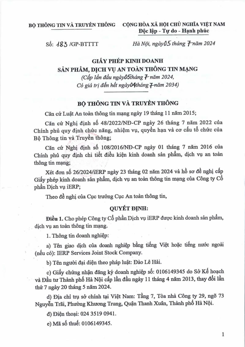 Vào ngày 5/7/2024, công ty iERP đã chính thức được Bộ Thông tin và Truyền thông cấp phép triển khai các dịch vụ về an toàn thông tin mạng. Đây là một bước tiến quan trọng, đánh dấu sự phát triển vượt bậc của iERP trong việc mở rộng và nâng cao danh mục dịch vụ của mình, nhằm đáp ứng nhu cầu ngày càng cao của các doanh nghiệp trong thời đại chuyển đổi số hiện nay.